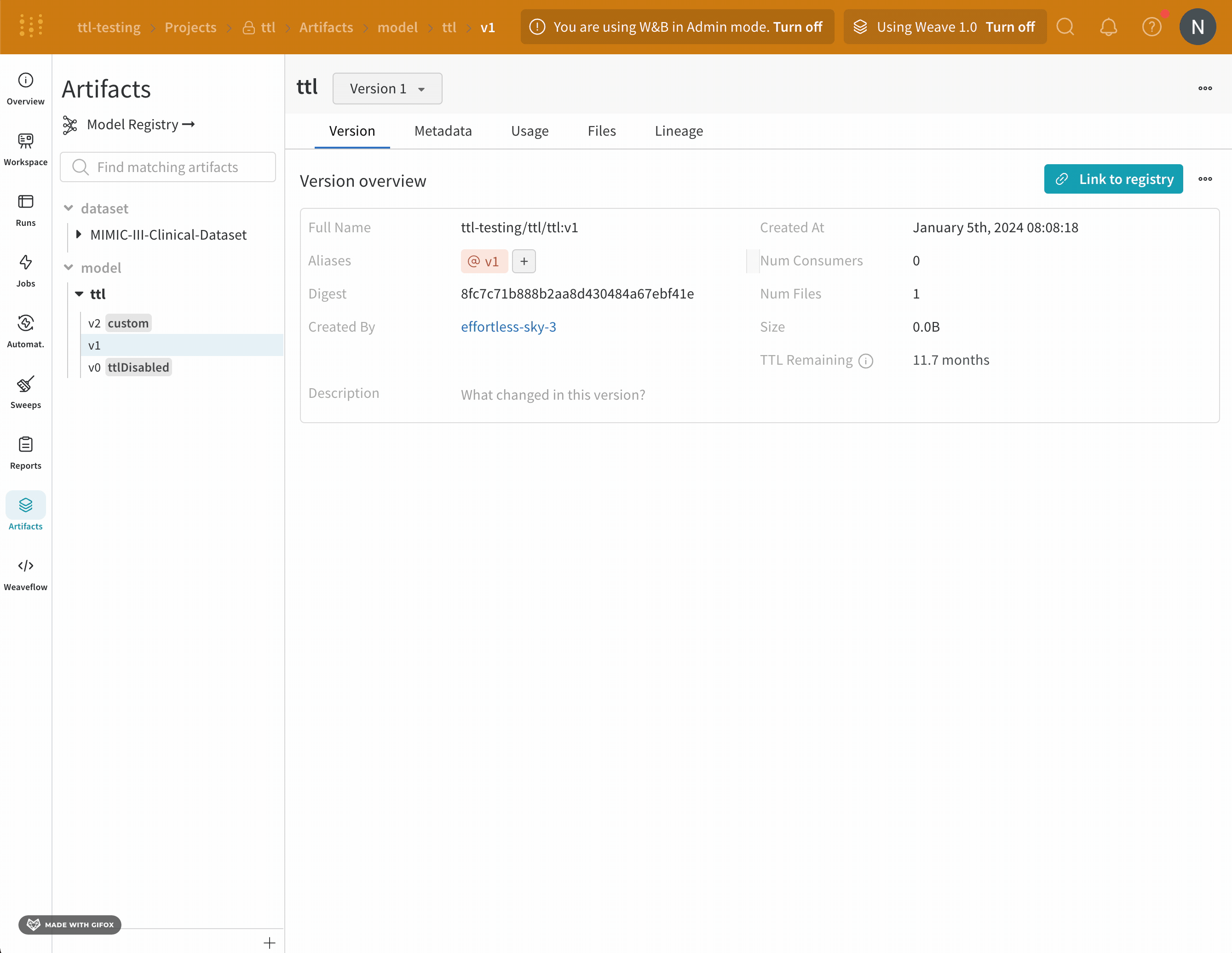 W&B は、モデルレジストリにリンクされたモデルアーティファクトの TTL ポリシーを設定するオプションを非アクティブ化します。これは、生産ワークフローで使用されるリンクされたモデルが誤って期限切れにならないようにするためです。