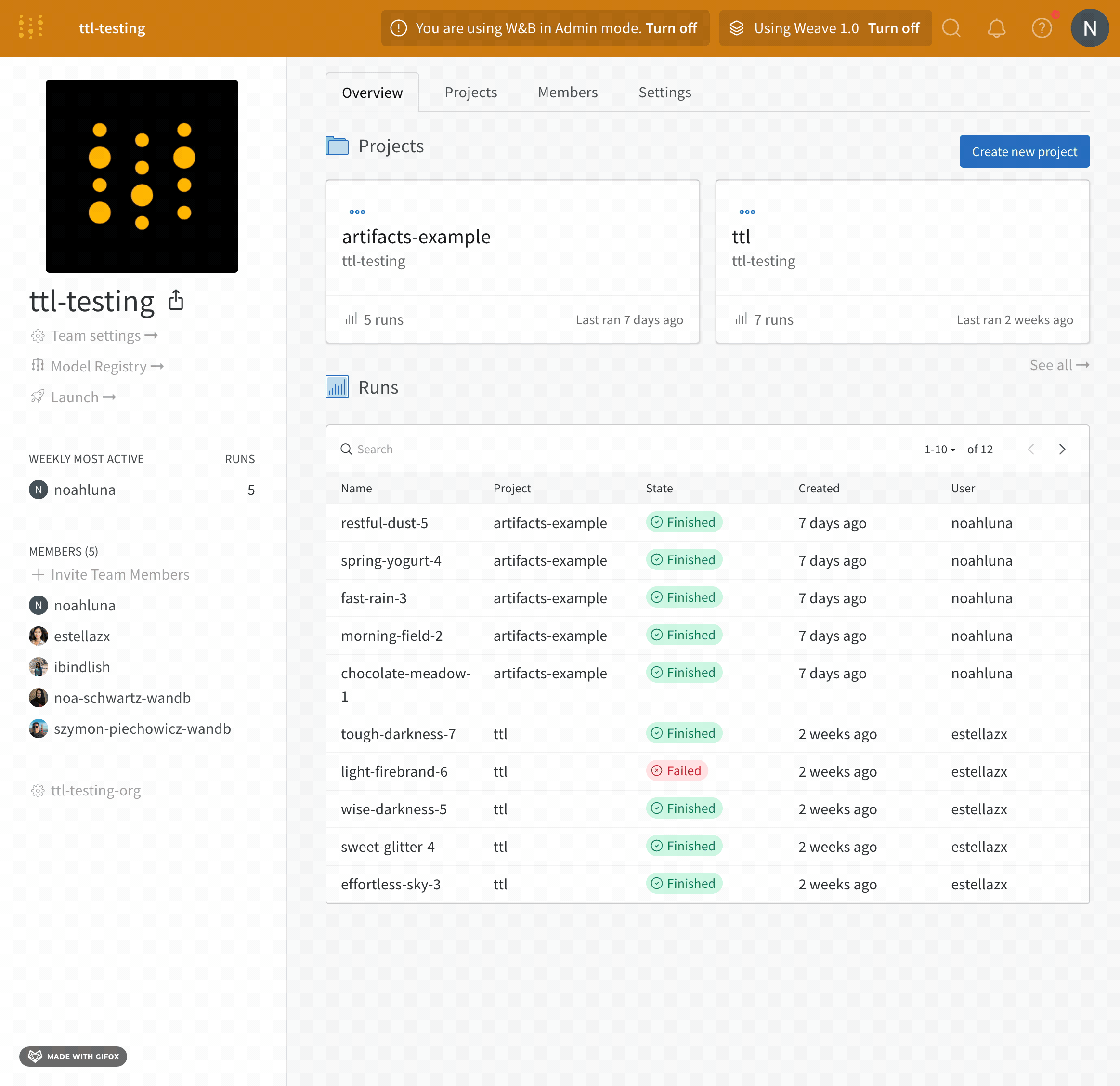 • W&B アプリ UI のアーティファクトの詳細に TTL ポリシーを設定または編集するオプションが表示されない場合、またはプログラムで TTL を設定してもアーティファクトの TTL プロパティが正常に変更されない場合は、チーム管理者が権限を付与していません。