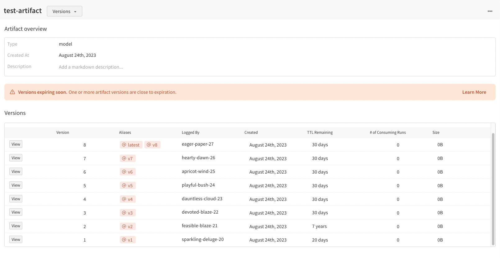 W&B Python SDK または W&B アプリ UI を使用して、アーティファクトの TTL ポリシーを確認します。